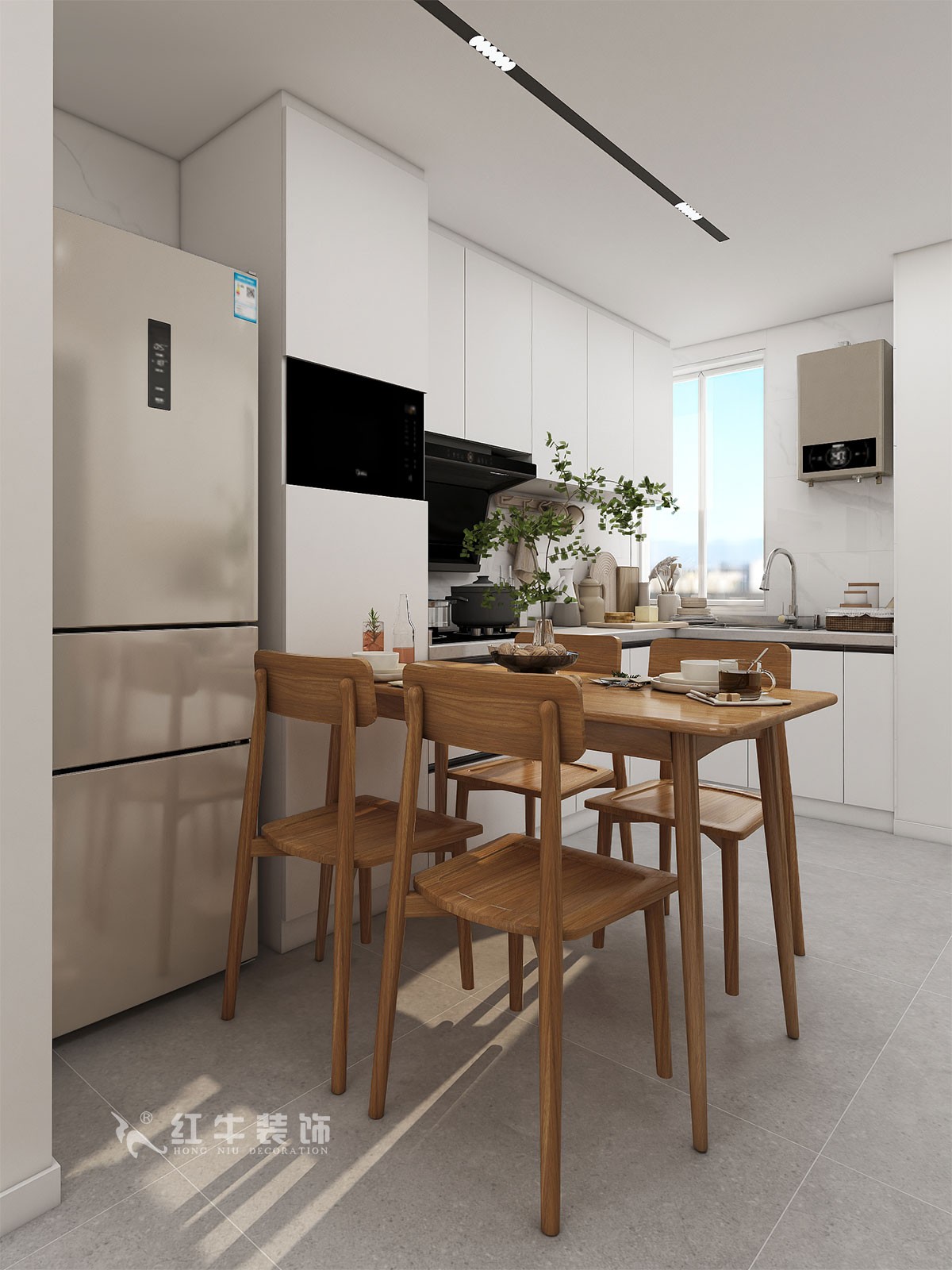 整體風(fēng)格簡(jiǎn)約,米灰色和木紋色營(yíng)造出溫馨的生活氣息,打通了餐廳和廚房的空間,增加了采光,擴(kuò)大了空間。