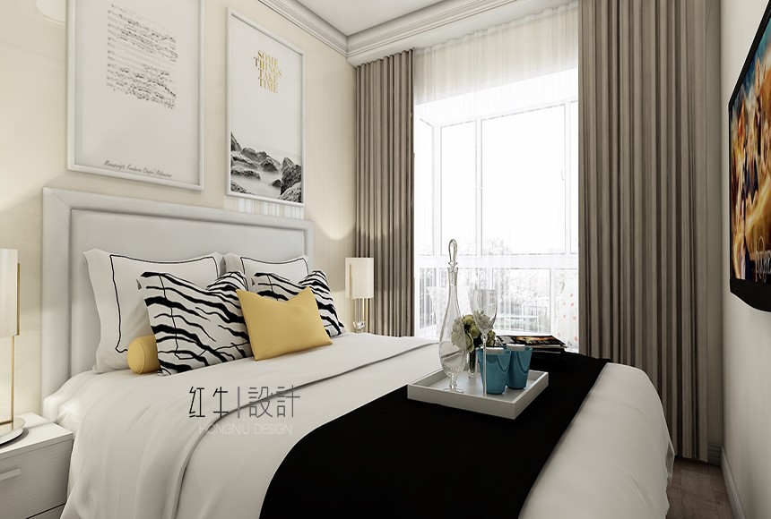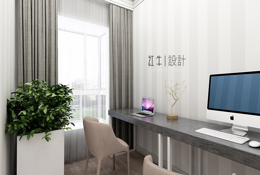 客餐廳色調(diào)清雅,休閑、隨性又不失精致,電視背景墻沒有過多的華麗修飾,給空間本身一個開拓、延展性,給居住者一個慵懶、明快的起居環(huán)境。主臥次臥,依靠家具本身的線條感,搭配寫實主義的裝飾畫,給人以休閑自在的視覺感受。書房是辦公空間,設(shè)計者在整面墻留白,搭配淺色條紋壁紙,給了本就不大的空間一個視覺的開放性,心情也自然就舒緩很多。