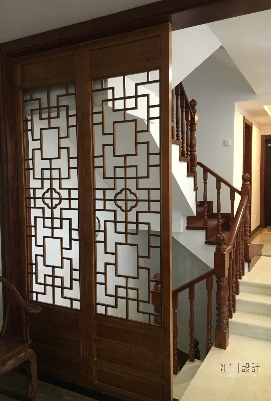 于是設(shè)計(jì)了一個(gè)大門套和兩扇木制的花格,很好地化解了樓梯對大門的問題。