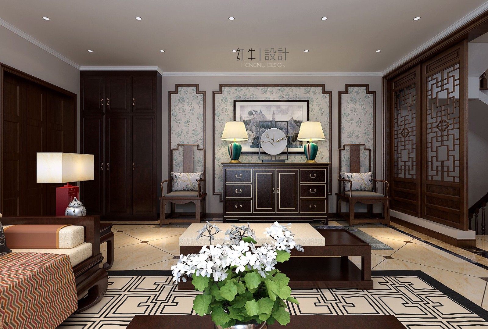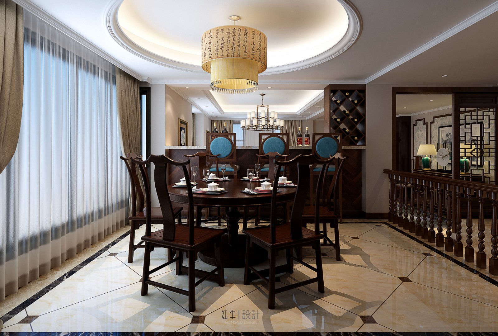 2、一層客廳大門入戶做了一組到頂?shù)男瘢阌陂T口換鞋方便和鞋子的一個(gè)收納空間,還有一個(gè)功能就是做了相對應(yīng)的一組假門,把原入戶門口一根110的下水管和混凝土結(jié)構(gòu)柱隱藏在其中,這樣能彌補(bǔ)下原建筑帶來的弊端。電視背景墻位置就選擇餐廳和客廳分割錯(cuò)層中間,做一個(gè)高度在1.5米的一個(gè)隔斷,這樣的設(shè)計(jì)能保持室內(nèi)空間南北通透和大空間帶來的視覺效果;樓梯間做了一個(gè)大的門套加兩扇木制花格,把傳統(tǒng)元素和現(xiàn)代元素結(jié)合,一現(xiàn)代人的審美需求來打造富有傳統(tǒng)韻味的細(xì)節(jié),即保留了傳統(tǒng)文化又體現(xiàn)了現(xiàn)代特點(diǎn),突破傳統(tǒng)風(fēng)格中的沉穩(wěn)有余活力不足的常見弊端;餐廳頂部根據(jù)原建筑大梁的位置,做了一個(gè)圓形吊頂,體現(xiàn)了中國傳統(tǒng)天圓地方的規(guī)律。