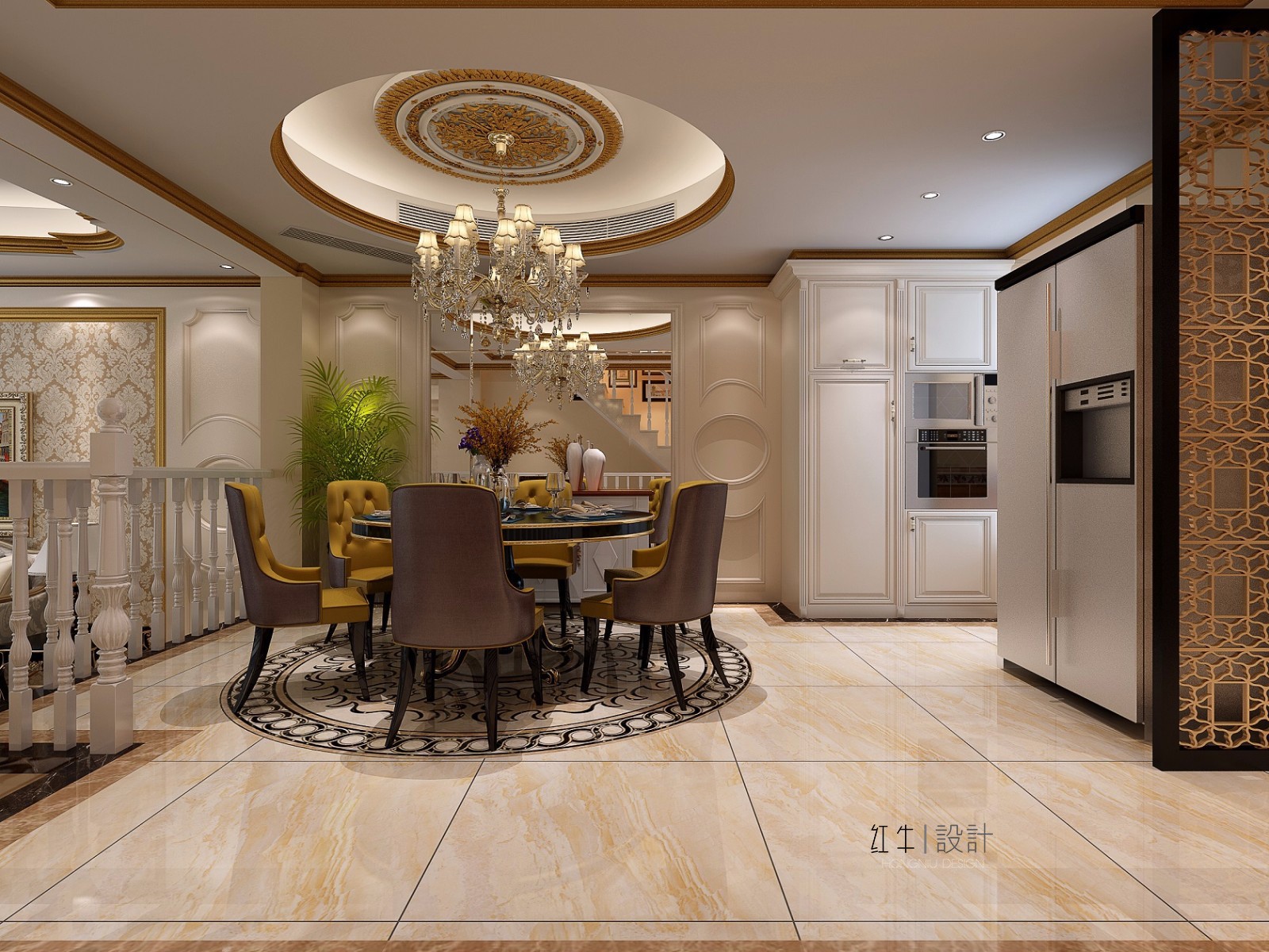 鏡子的反射能夠擴(kuò)大客廳視野,有了鏡子,客廳仿佛大了一倍。圓形的吊頂與華貴的吊燈相結(jié)合,大氣又時(shí)尚。因?yàn)閺N房空間比例相對(duì)較小,所以冰箱被放在了餐廳區(qū)域。