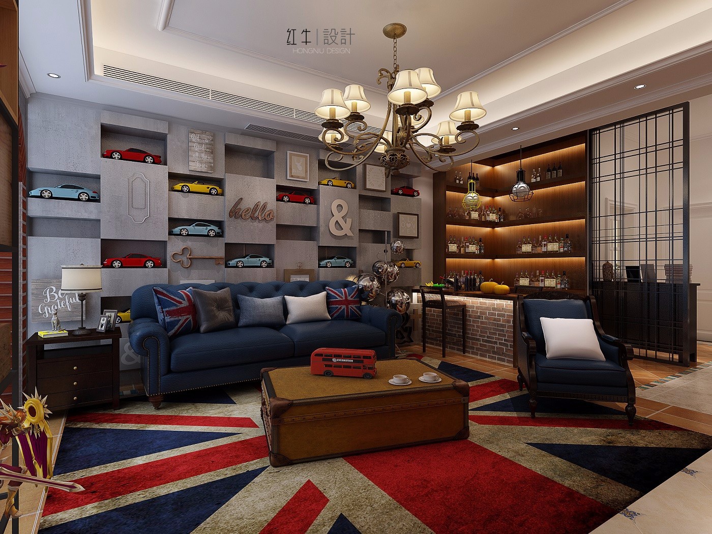 墻上的美隊(duì)盾牌,沙發(fā)背景墻上汽車(chē)模型,架子上的手辦都是年輕人的興趣所在;手提箱形狀的茶幾以及電視下面的柴火,都極具個(gè)性;英國(guó)國(guó)旗圖樣的地毯與沙發(fā)上同圖案的抱枕相呼應(yīng),充滿時(shí)尚感。這一切無(wú)不顯示出這是年輕人的休閑場(chǎng)所。
