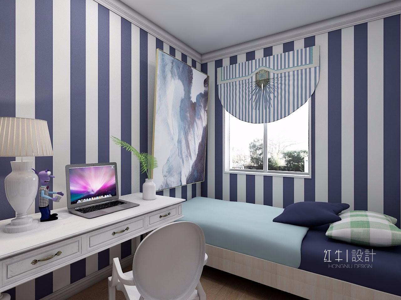 次臥起主導(dǎo)作用的便是藍白兩種顏色,不同深淺的藍色在墻壁、窗簾、裝飾畫、床品中出現(xiàn),讓整個空間飽滿而富有層次。