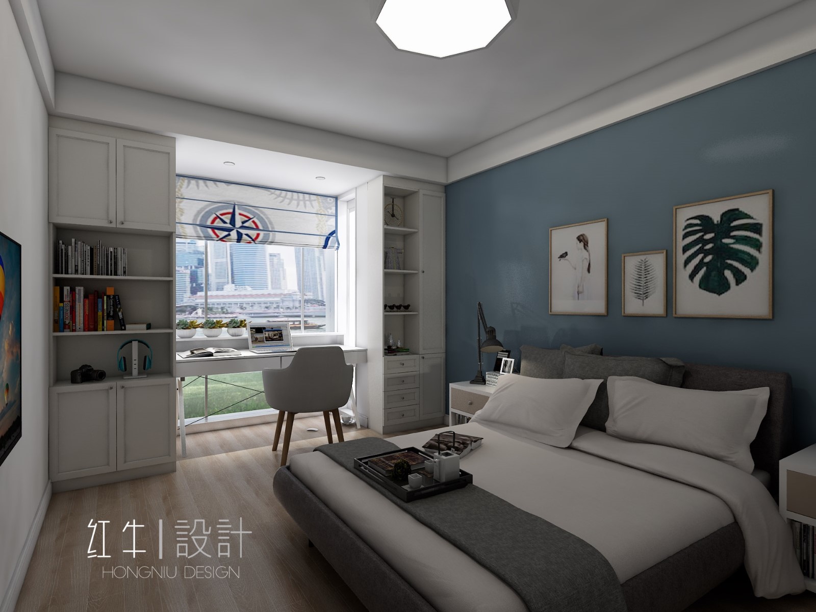 背景墻顏色藍(lán)中帶灰,給人柔和、沉穩(wěn)、低調(diào)的感覺,非常適合臥室。