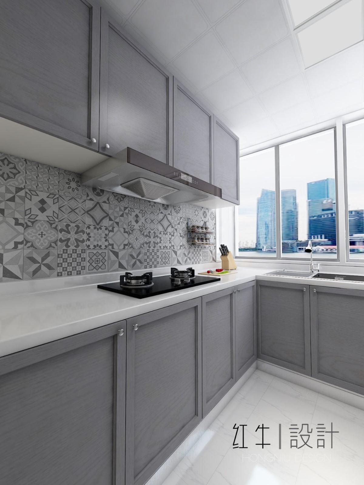 頂柜與底柜之間的墻面上,貼上同一風(fēng)格、不同花紋的瓷磚,輕松打造出視覺焦點,讓這小小的廚房一秒鐘變身文藝范。