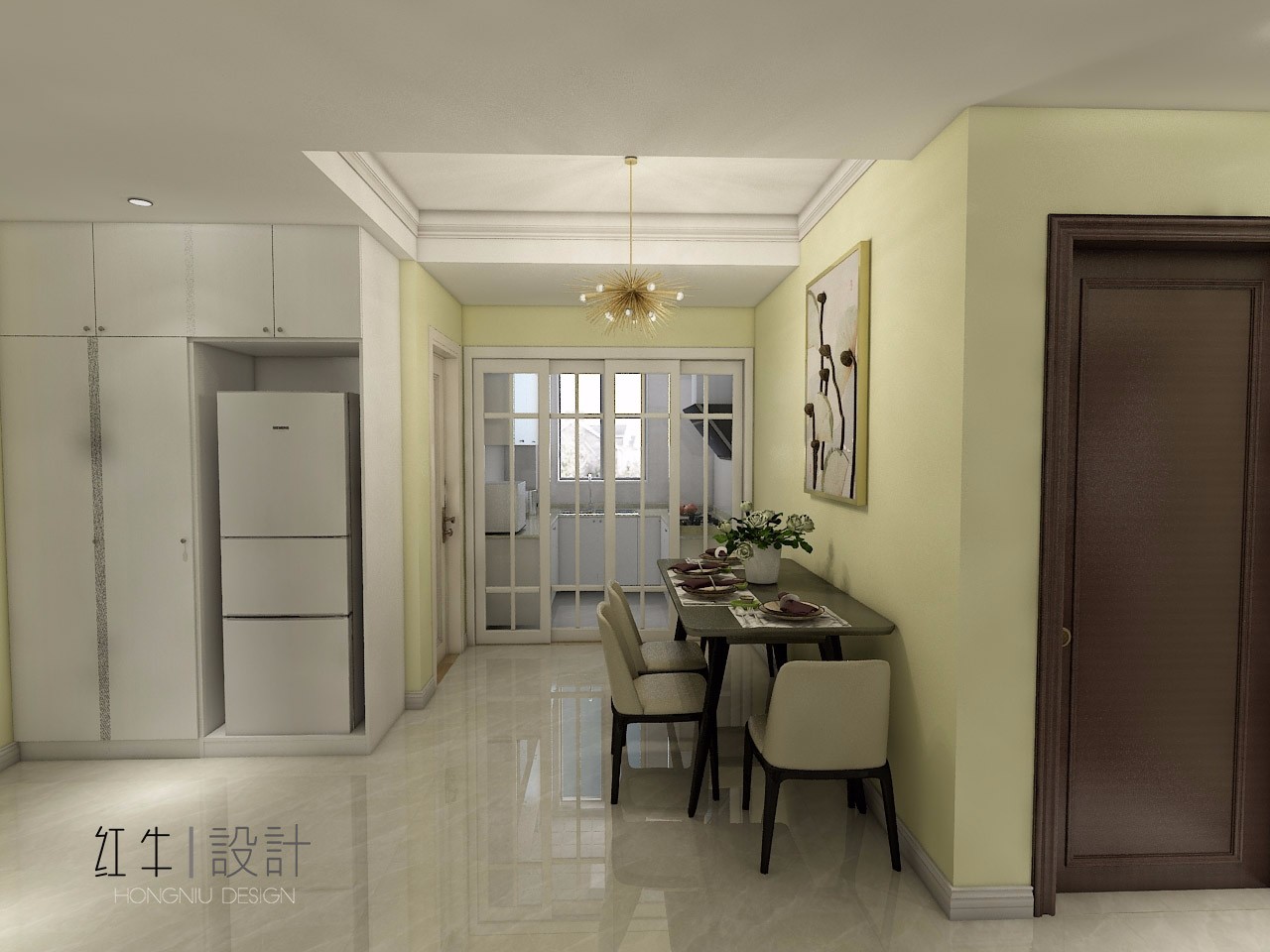 本案改變了次臥和衛(wèi)生間的進門方式,在此安裝了柜子,增加了收納面積。因為廚房面積比較小,所以冰箱被放到了餐廳。