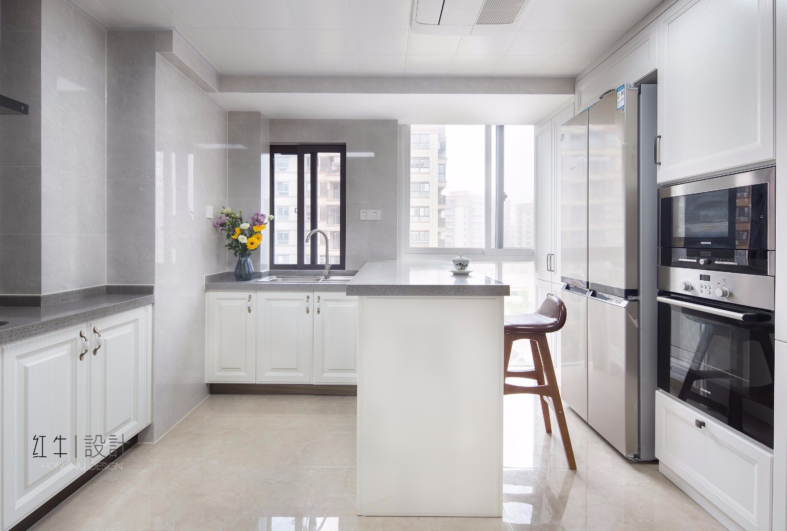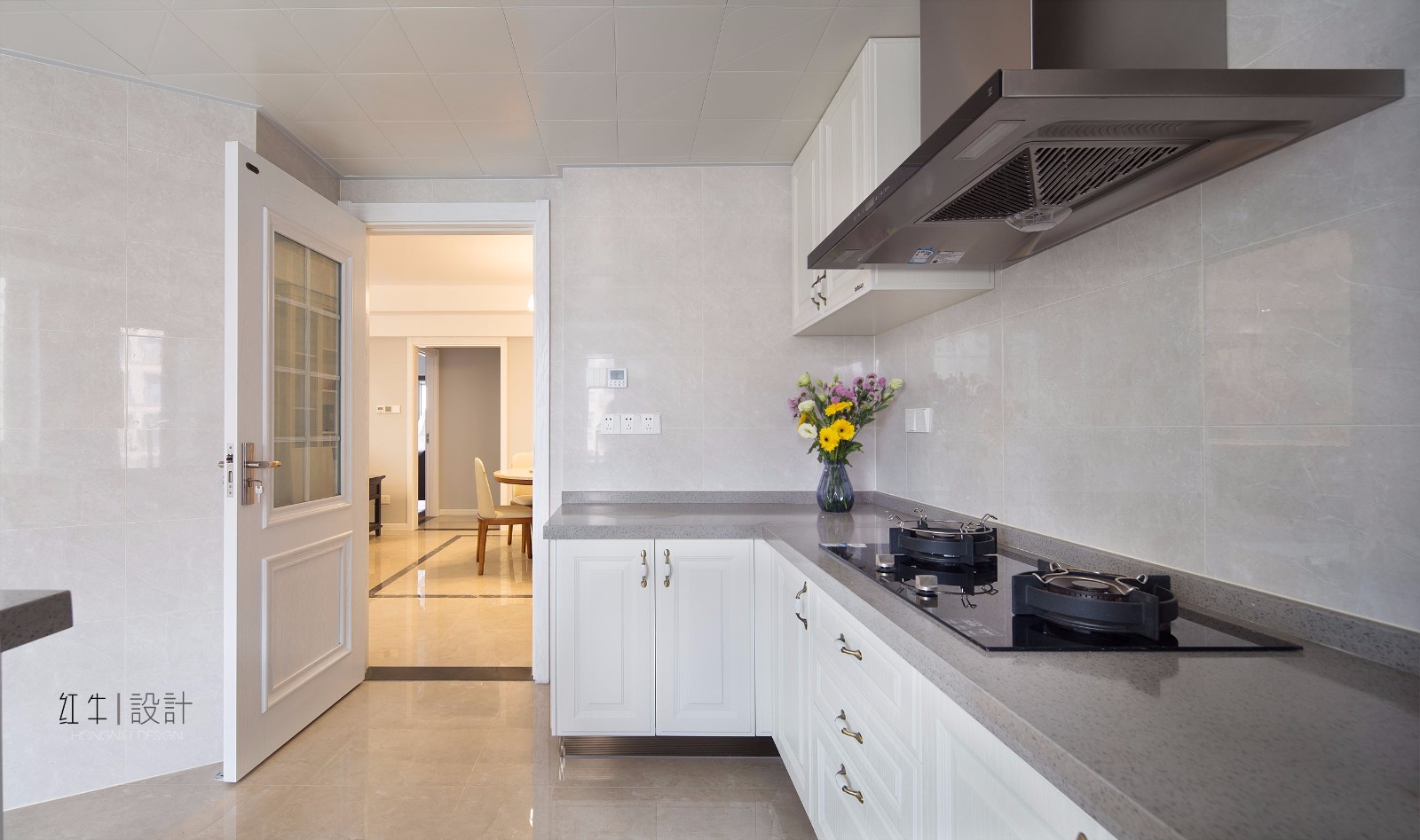 廚房經(jīng)過(guò)改造,整體看起來(lái)非常開(kāi)闊,白色的櫥柜、灰色的臺(tái)面,看起來(lái)整潔大方。