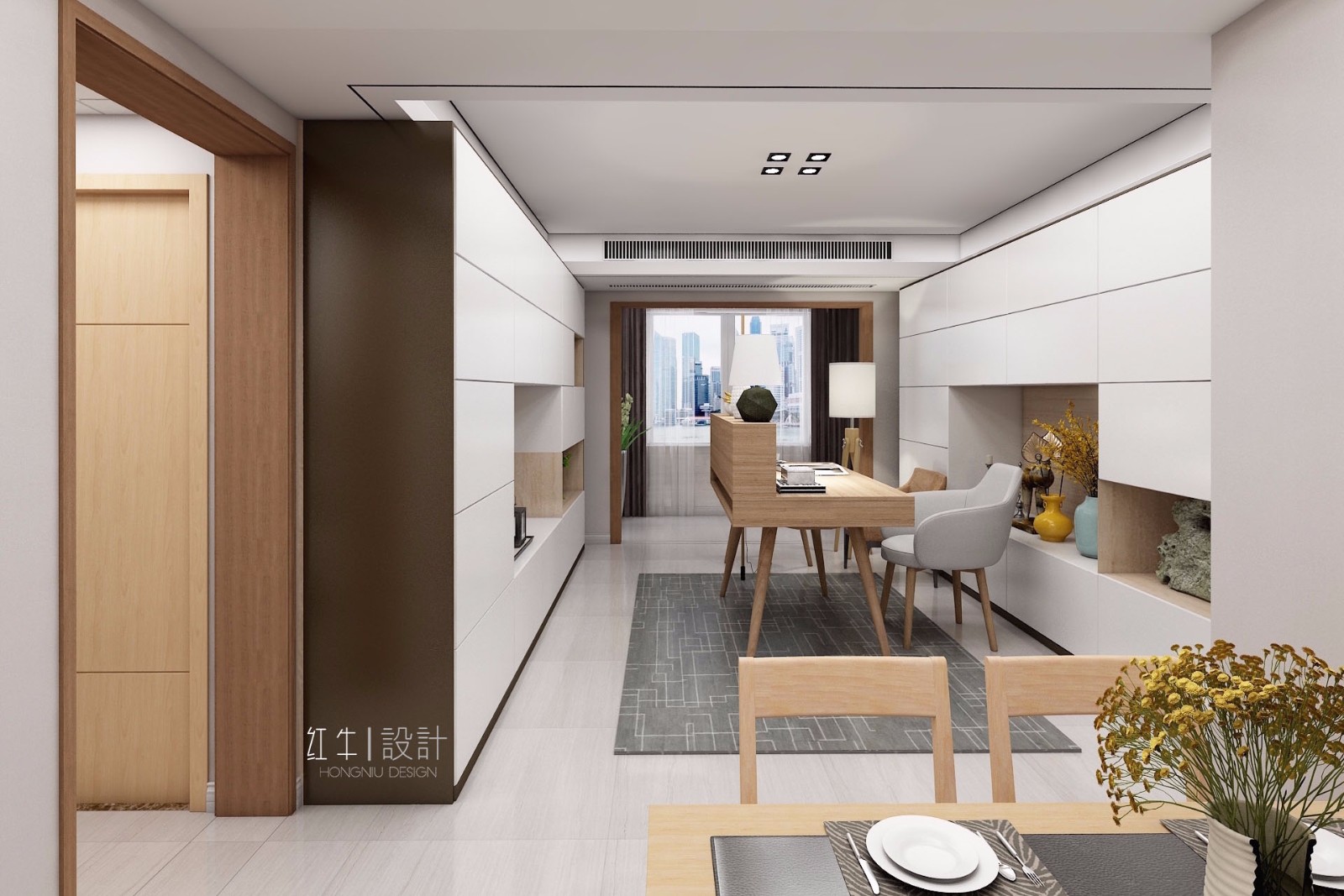 客餐廳色調(diào)清雅,休閑、隨性、精致,電視背景墻距離沙發(fā)過遠,中隔的半墻在分區(qū)后巧妙騰出一個半開放的書房空間。設計者在整面墻留白,像一條小路通向遠方,給了本就不大的空間一個視覺的開放性,心情也自然就舒緩很多。