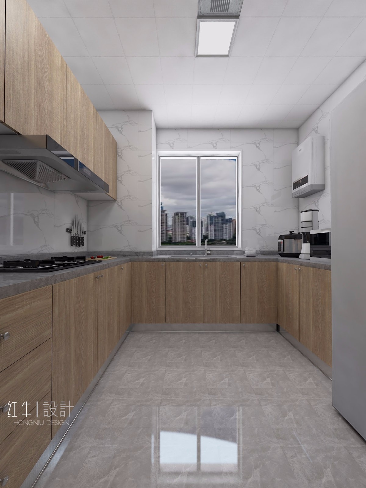 木質(zhì)櫥柜看起來(lái)既干凈舒適又實(shí)用方便?;疑呐_(tái)面展現(xiàn)出一種高級(jí)感,搭配墻面瓷磚的光澤紋理,優(yōu)雅與矜貴呼之欲出。