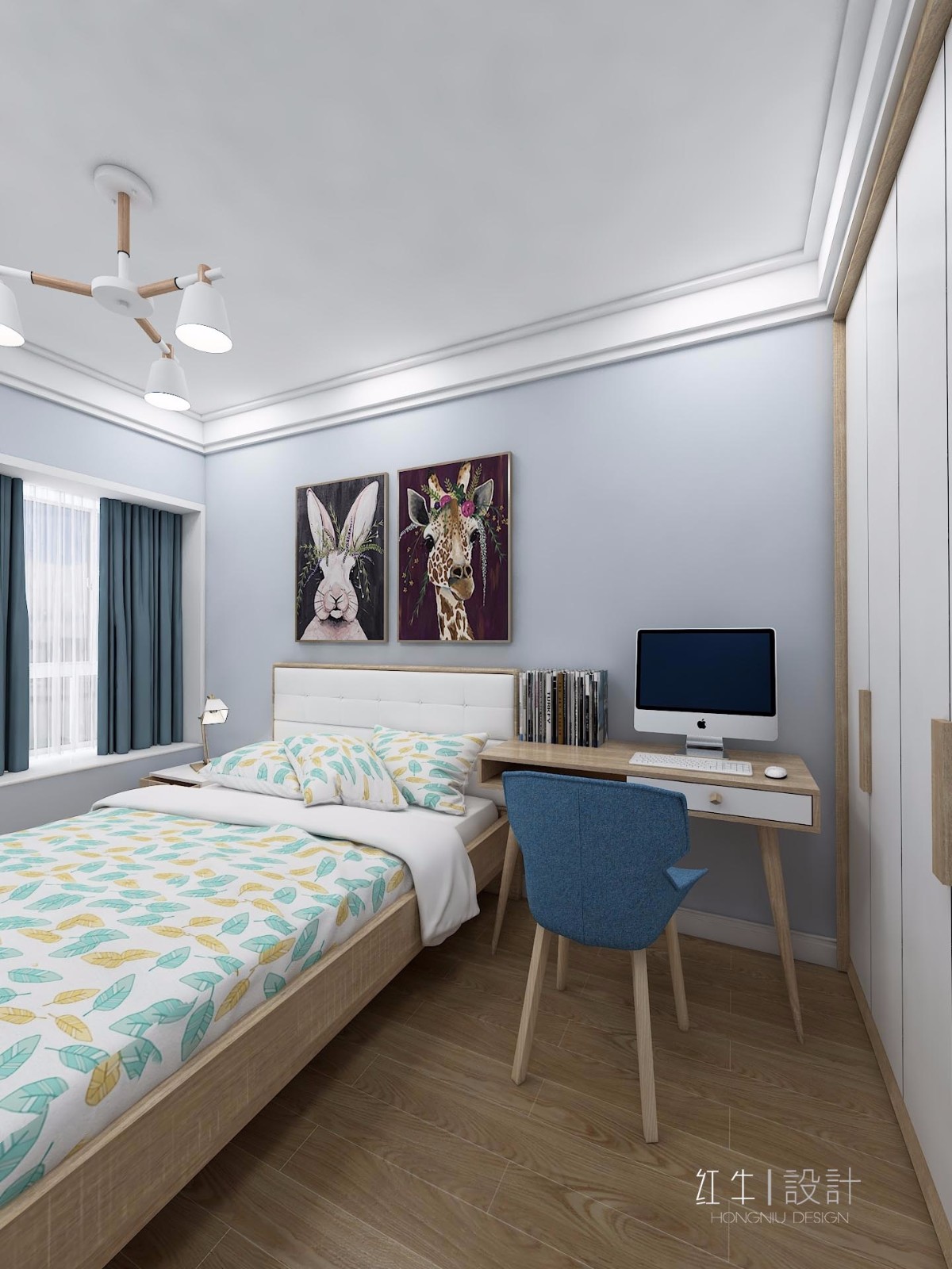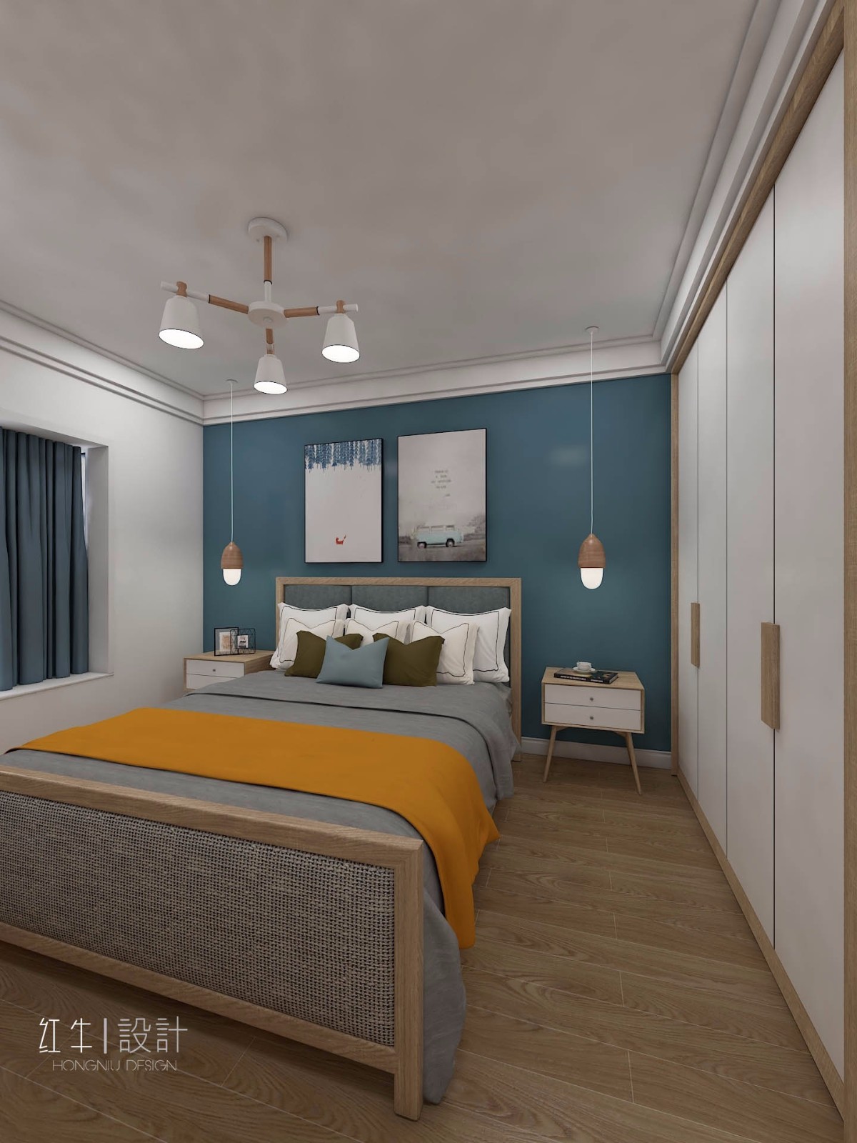 清新的床品、綠色的窗簾、以及床頭的桌椅,都是典型的北歐風(fēng)格。淺藍(lán)色墻面給人清爽的視覺(jué)感受,使人得以放松下來(lái)。