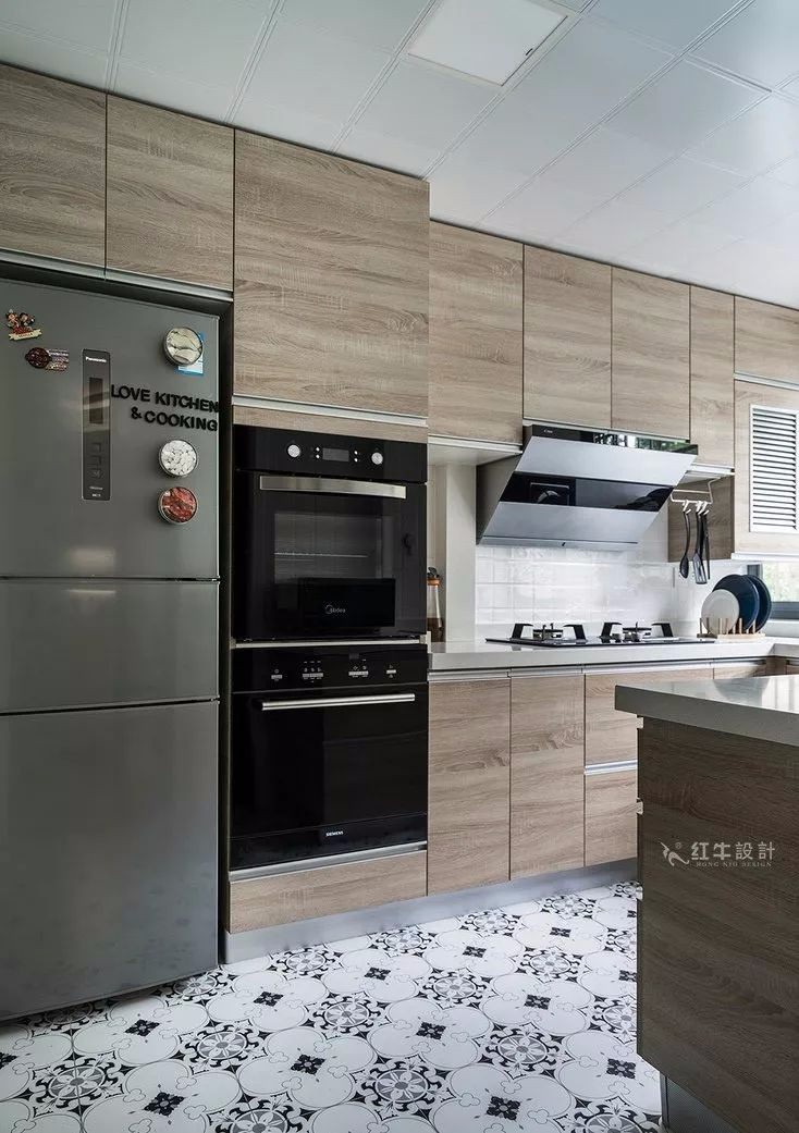 廚房整體造型簡約內(nèi)斂,利落清爽。地面鋪上花磚,打破大面積純色的沉悶,展現(xiàn)獨特的情調(diào)。