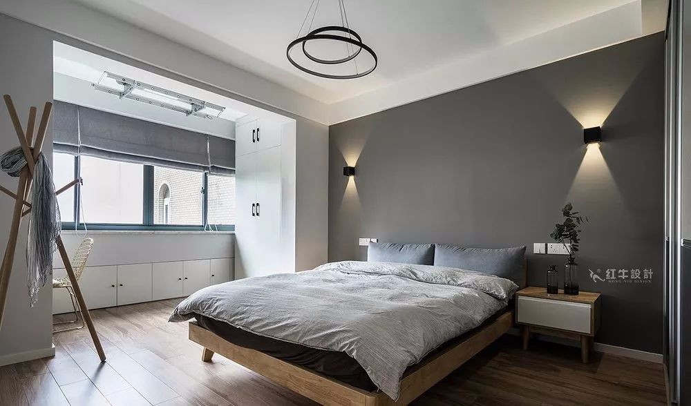 灰色的背景墻搭配壁燈,撲朔迷離的光影讓臥室呈現(xiàn)出一種朦朧美。