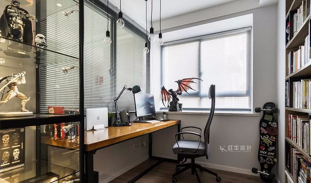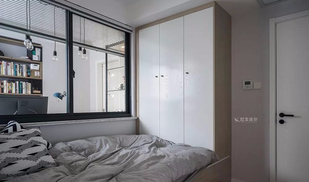 次臥與書房相鄰,透明的玻璃窗能夠提高空間采光效果,需要私密空間時,關(guān)閉百葉窗簾即可。