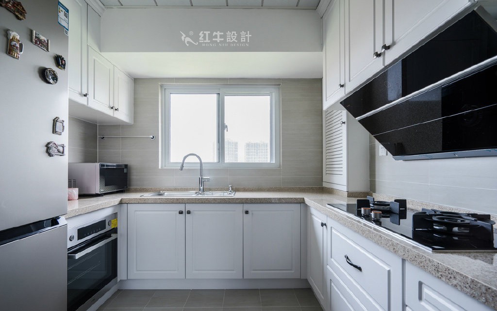 白色櫥柜十分清爽,打造干凈利落的廚房空間,百葉門美觀的同時(shí)還利于空氣流通。
