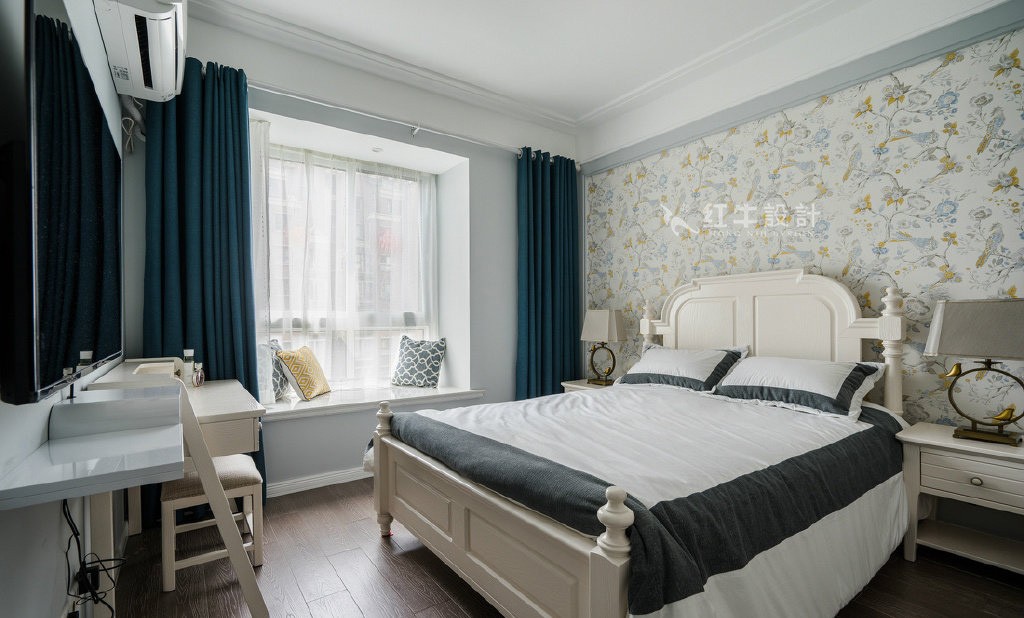 背景墻上的花鳥(niǎo)圖案清新又有情調(diào),臺(tái)燈圓環(huán)上裝飾的金屬小鳥(niǎo)精致美觀,臥室整體的協(xié)調(diào)帶給人舒適的視覺(jué)體驗(yàn)。