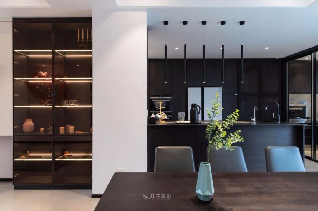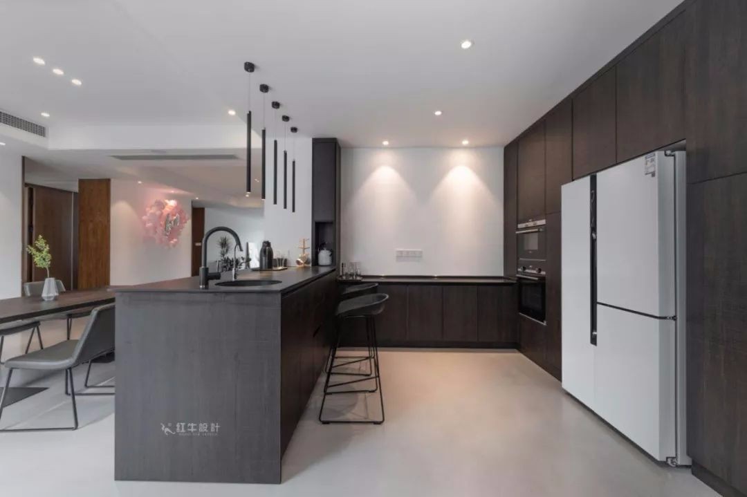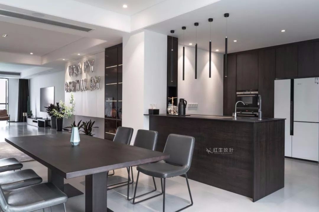 客餐廳位于同一空間,整體采用無主燈設(shè)計,平面吊頂內(nèi)嵌筒燈提供主照明,廚房吧臺上方的長筒吊燈造型獨(dú)特。