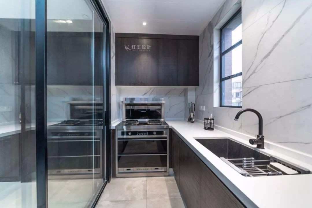 此外,還專門設(shè)計了中廚空間,如果制作油煙較大的中式菜肴,可以關(guān)上玻璃推拉門,在里面進(jìn)行制作。