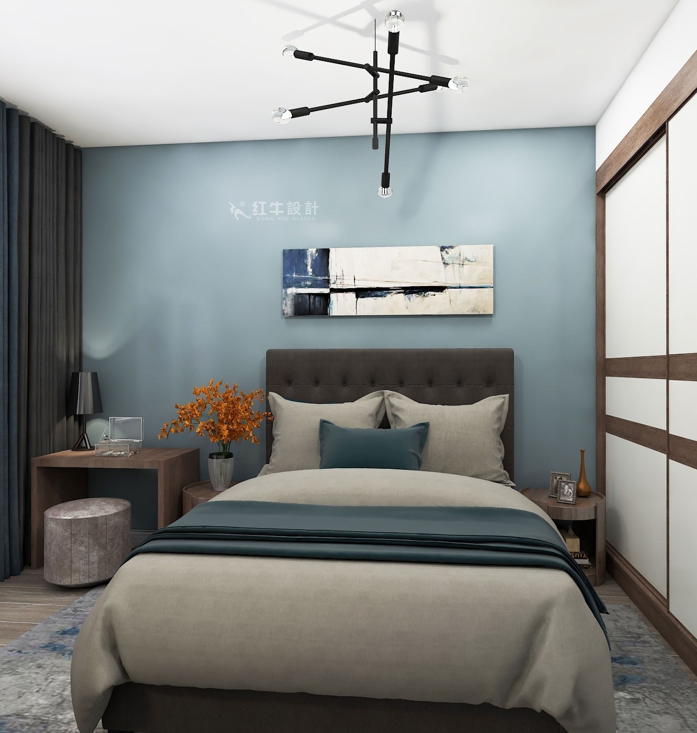 在方案中沒有做過多的造型,通過墻面的顏色和木質(zhì)元素搭配,局部點綴了一些金屬材質(zhì)來深化空間,讓空間看的更加高級一些。