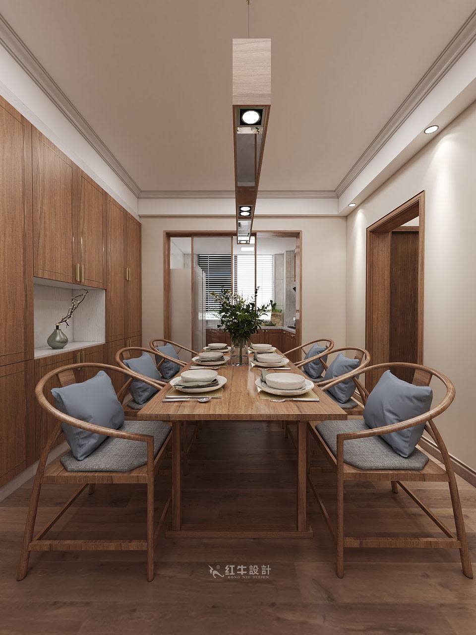 長條餐桌充實餐廳空間,盡顯大氣,搭配長條吊燈恰到好處。相同色系的埡口套,展示出整體設計的和諧之美。