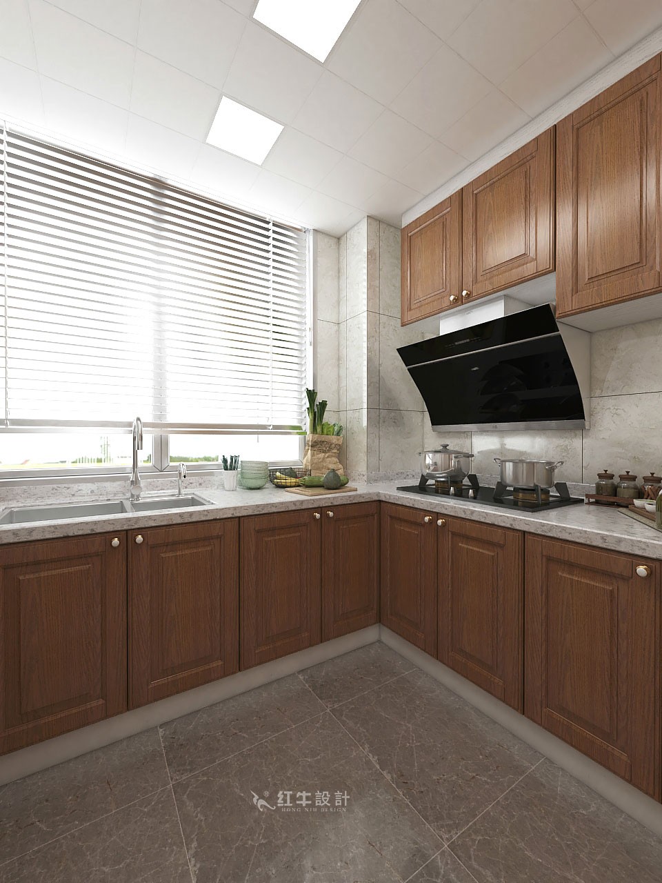 廚房的設計既具備東方文化風韻,又結合了西方時尚美學。百葉窗能夠調節(jié)光線,均勻散入室內的光線將帶來悅目之感。