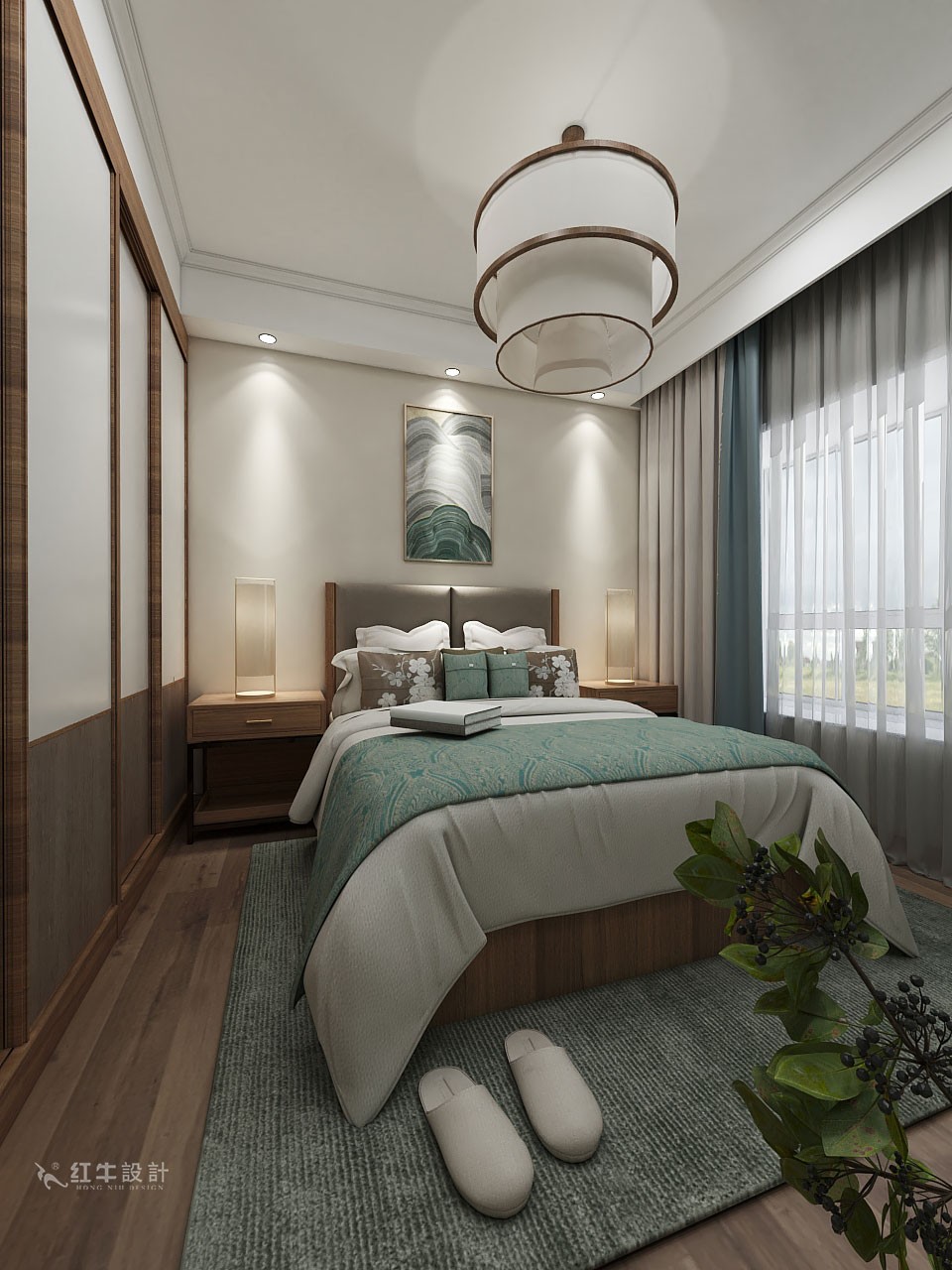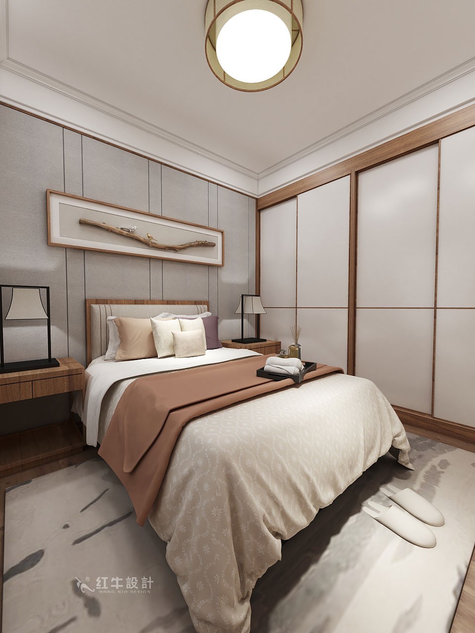 臥室做了一個空間層次的對稱,沒有太多的去凹造型,整體呈現(xiàn)出平和內斂、古樸端莊的氣質。