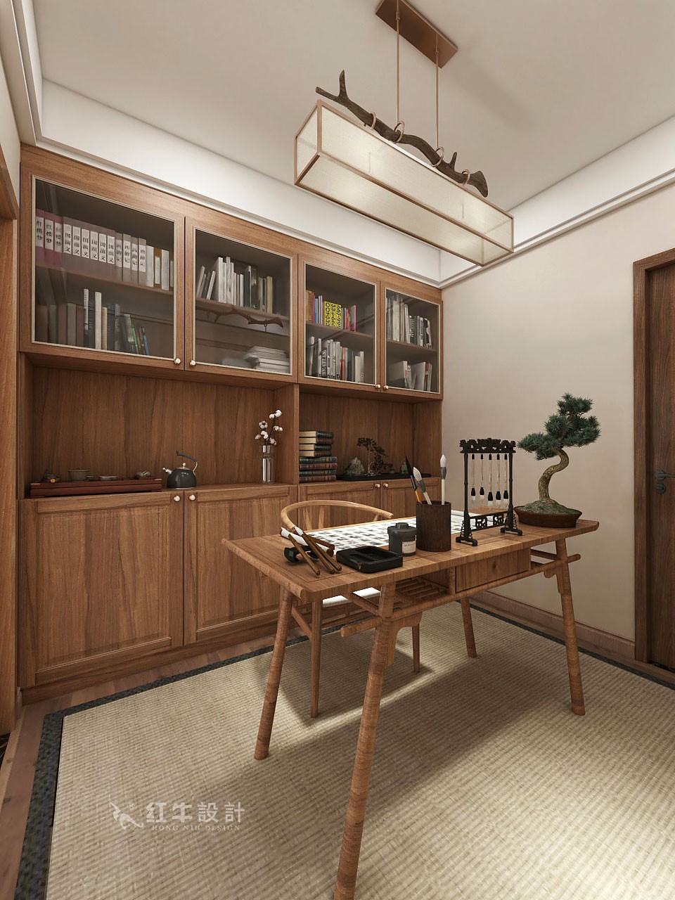 古色古香的書桌,精致的茶具、筆架,盆景,渲染出一種溫婉和諧、情趣盎然的意境,在這里讀書想必是一種享受。