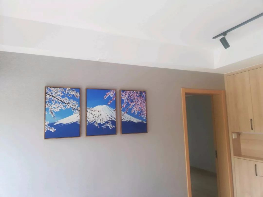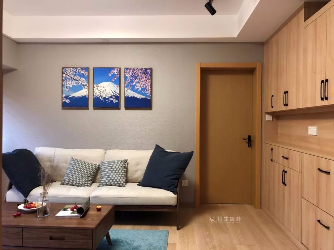 客廳的三聯(lián)裝飾畫構(gòu)成一個(gè)完整的富士山圖景,極具日式風(fēng)情。