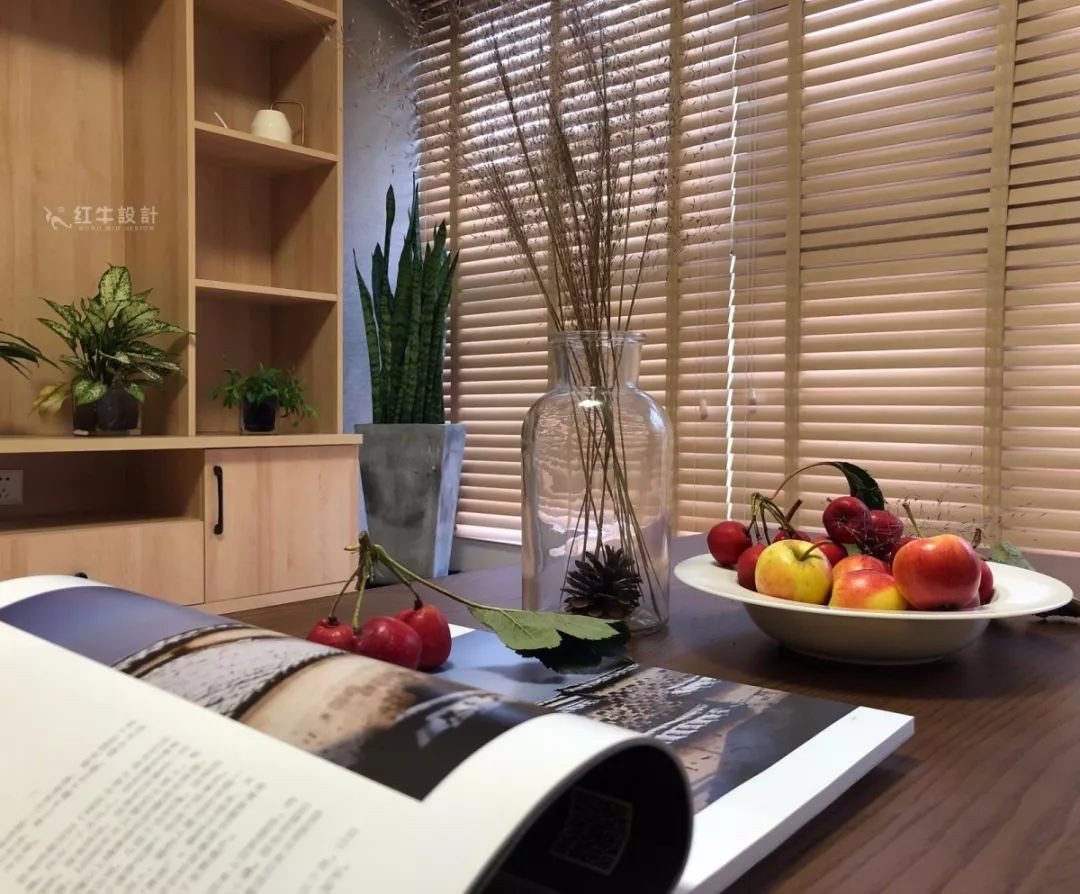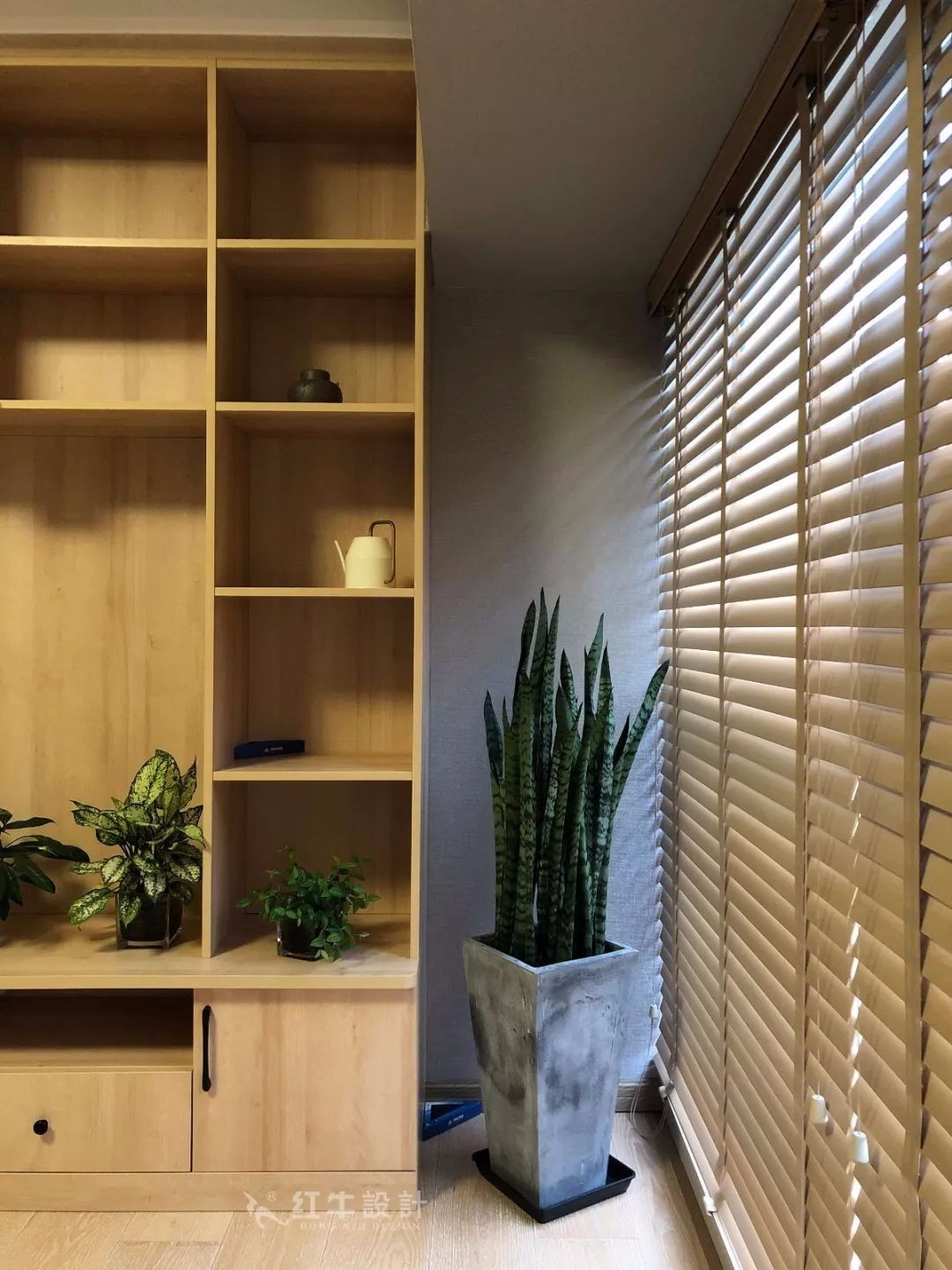 木色的百葉窗,與整體風(fēng)格十分協(xié)調(diào),陽光透過百葉窗照進(jìn)來,多么富有詩意。