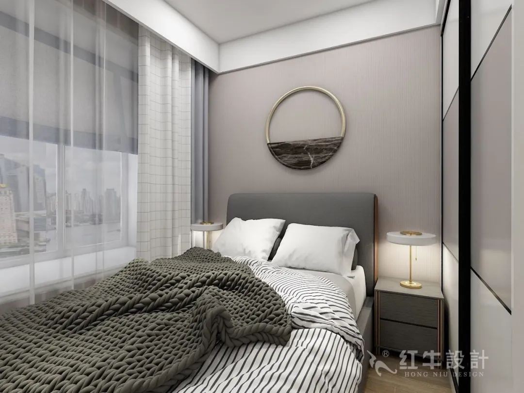 淺灰色很好地表達(dá)出臥室的清新舒適,圓形裝飾畫(huà)起到了很好的裝飾與點(diǎn)綴的作用,精致的臺(tái)燈增加了空間美感。