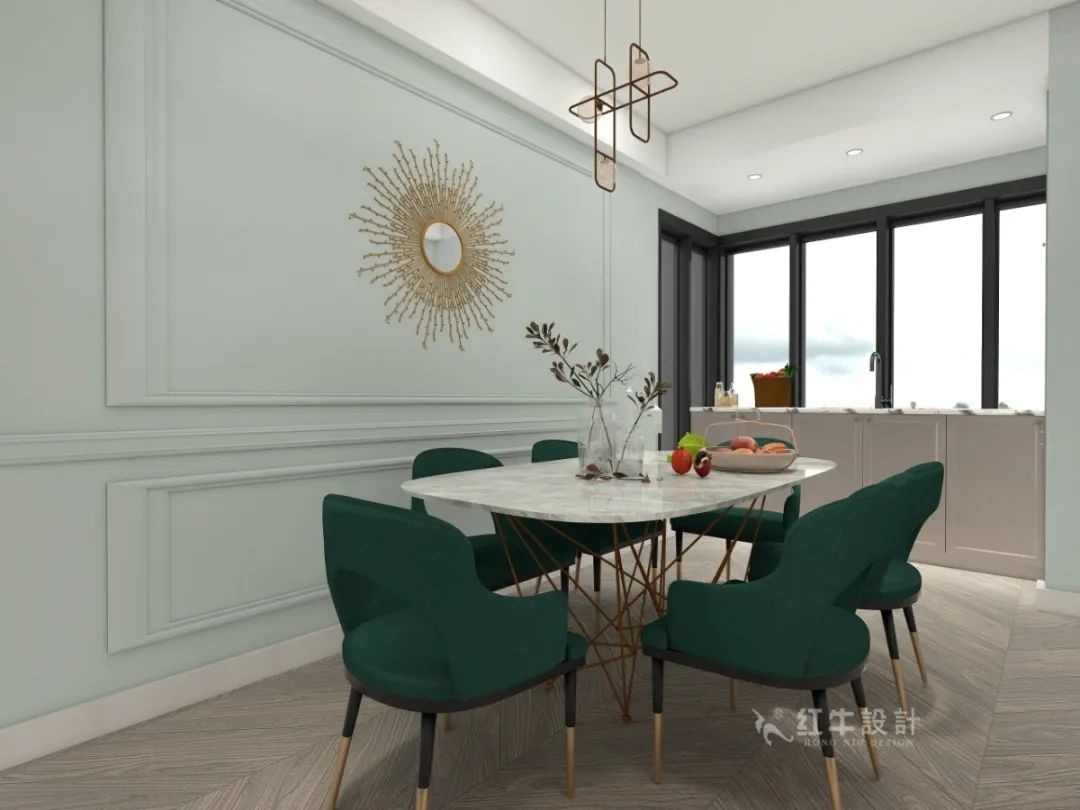 復(fù)古魚(yú)骨拼搭配墨綠絲絨質(zhì)感單人椅,搭配簡(jiǎn)約金屬吊燈,營(yíng)造輕奢的客廳氛圍,也塑造了每天的用餐儀式感。