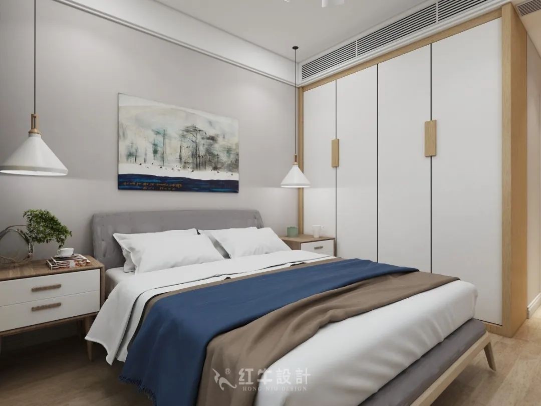 灰色調(diào)背景墻,布藝的床頭簡潔大方。床頭柜和衣柜非常協(xié)調(diào),兩側(cè)的床頭吊燈充分體現(xiàn)的了時尚感,同時也讓床頭柜的空間釋放出來。