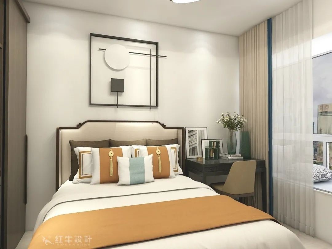 臥室主要以寧靜、偏暖的色調為主,柔和的燈光給人以溫馨、朦朧的視覺美感,床品上的色彩和圖案讓人感受到濃濃的人情味。