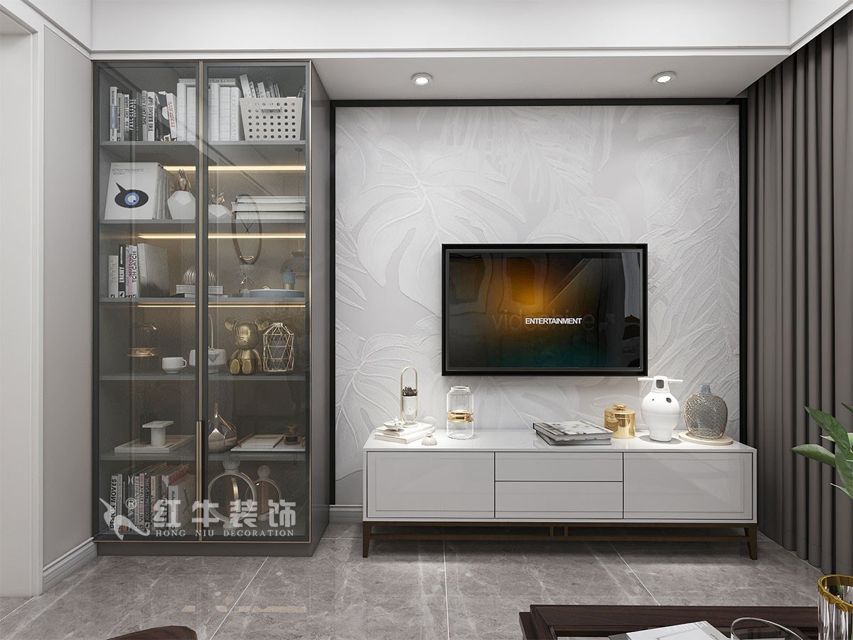 電視背景墻部分采用黑金屬線條搭配墻布的處理,結(jié)合玻璃柜面板,將輕奢元素融入。餐桌椅也使用金屬質(zhì)感進(jìn)行搭配,將整個(gè)空間的高級(jí)感體現(xiàn)出來。