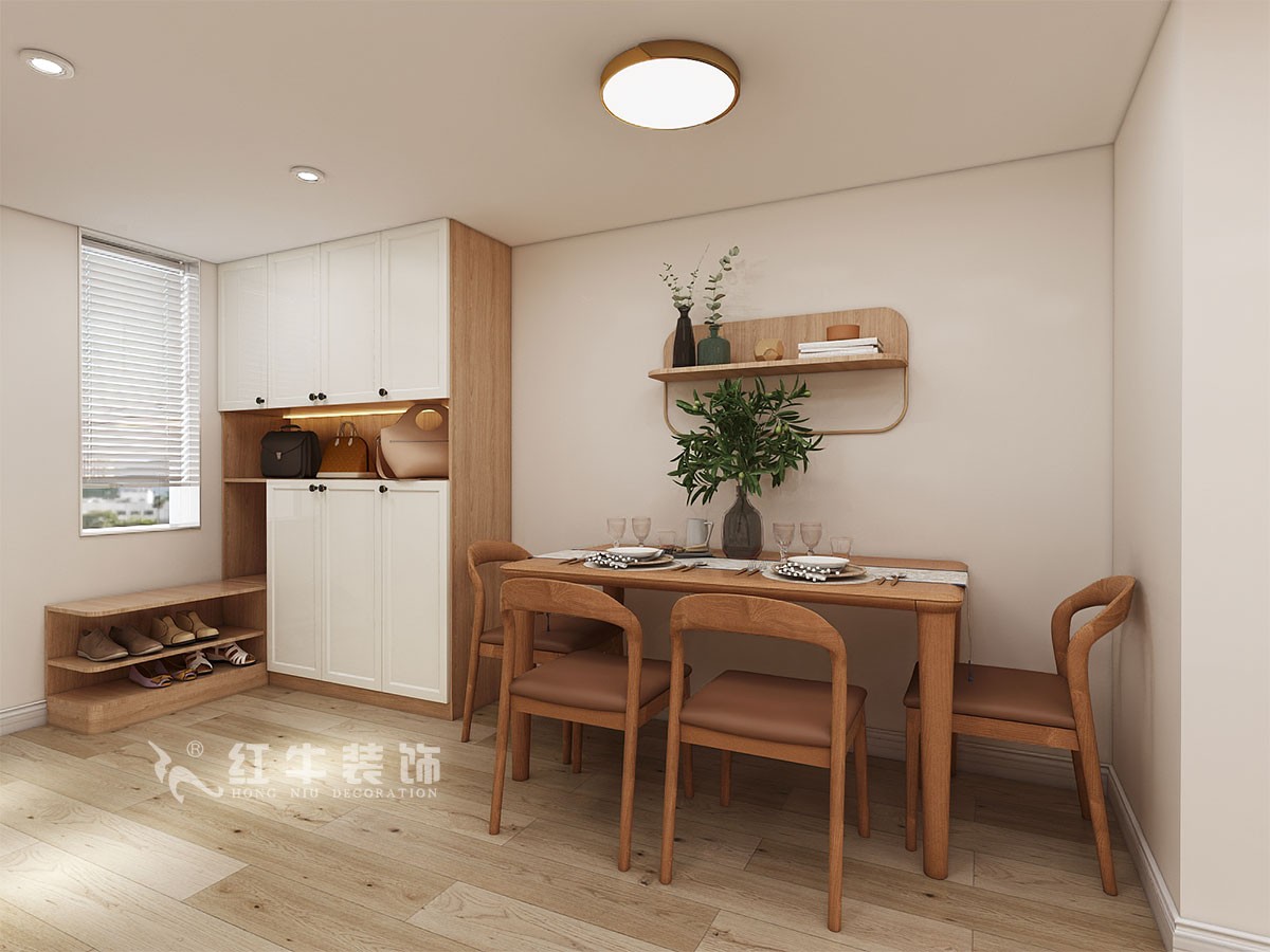 進(jìn)門后可以坐在換鞋凳上脫鞋子,再收到開敞式鞋架里面,保持玄關(guān)的整潔。面積不大的餐廳選擇把餐桌靠墻擺放,墻面上以擱板做裝飾,上面擺放工藝品及插花,提升了空間的審美效果。