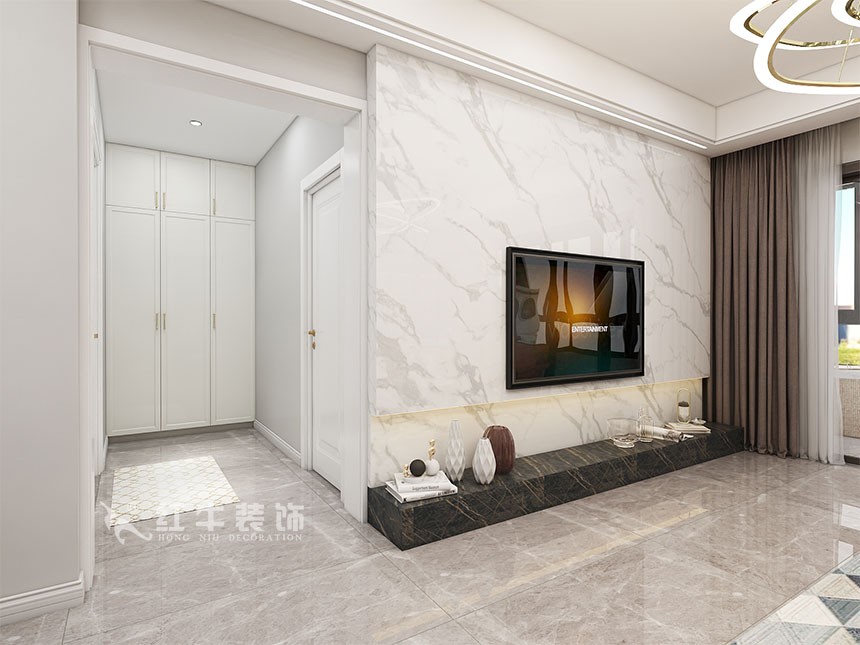 大理石紋理背景的電視墻,下方設計了燈帶,并且結(jié)合石材地臺作為電視柜,壁掛電視機,整個電視墻的設計簡潔而優(yōu)雅。