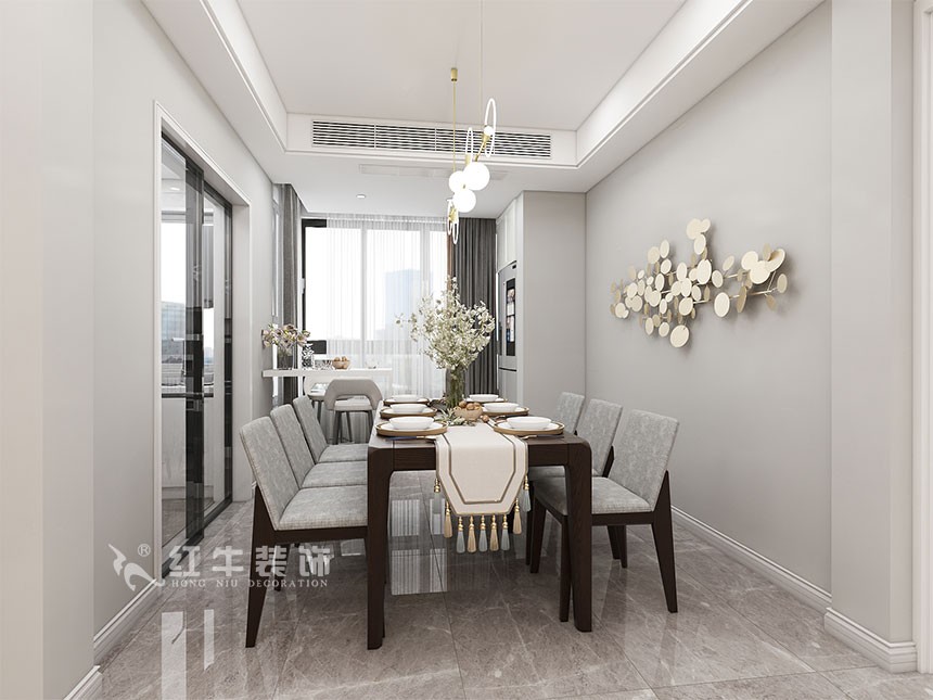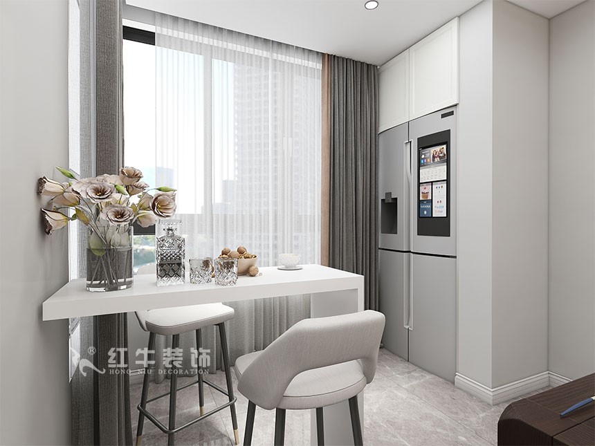客廳北陽臺打通并入餐廳,冰箱外置,增加廚房內(nèi)部電器空間,增加了餐廳水吧臺,層次更分明,提升了整體效果。