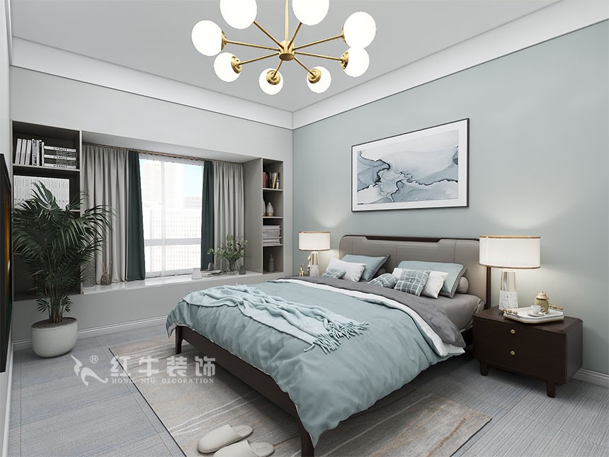 藍色中加入一點灰調(diào),增加一些質(zhì)感,搭配木質(zhì)家具以及黃銅元素的燈具,融合進輕奢元素,打造清新愜意的臥室氛圍。