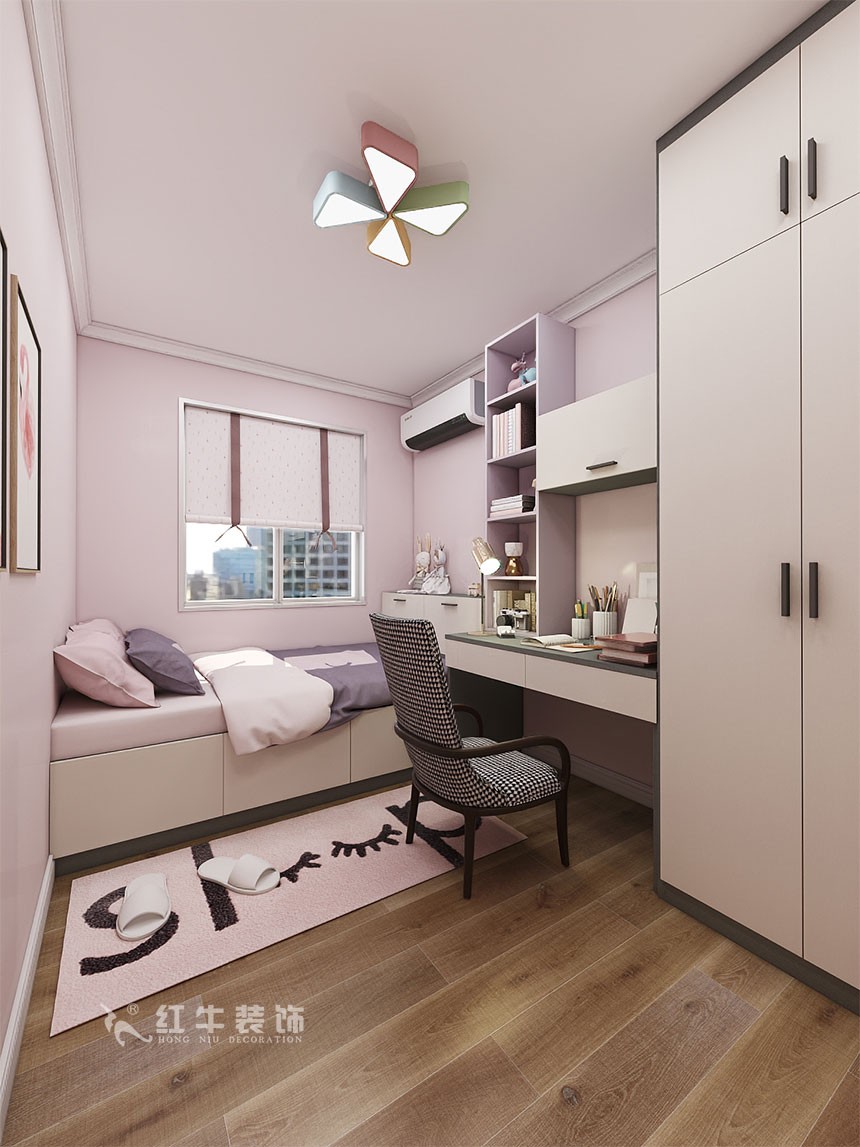 整體風(fēng)格簡約,白色和木紋色營造出溫馨的生活氣息,次臥室設(shè)計了組合柜,既有學(xué)習(xí)的區(qū)域同時也兼顧了休閑空間。