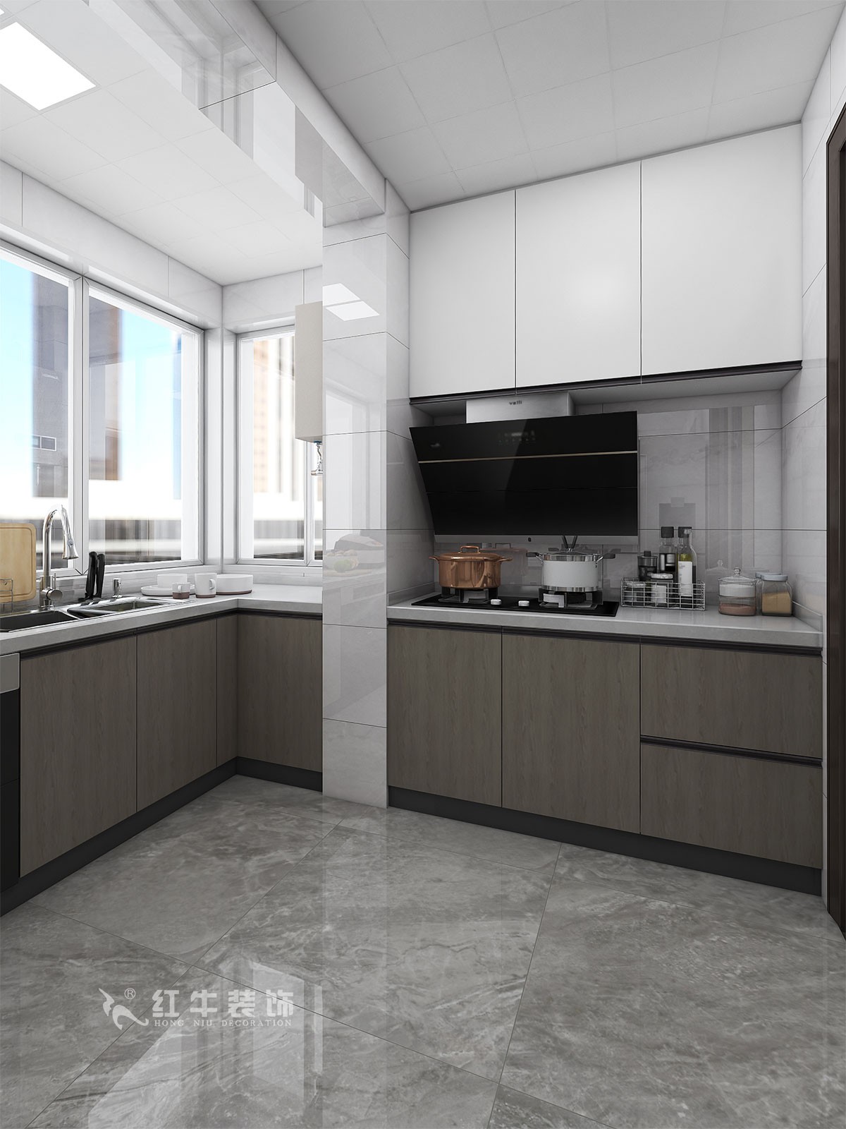 客廳北陽臺(tái)打通并入廚房,增加廚房?jī)?nèi)部電器空間,層次更分明,提升了整體效果。
