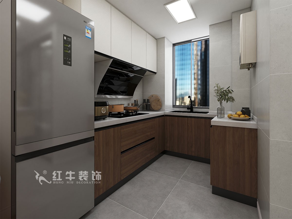 整體風格簡約,米灰色和木紋色營造出溫馨的生活氣息,北陽臺劃入廚房用。